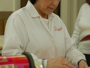 Judy Moss, photographed packaging chocolate at Dinstuhl's Fine Candies, where she's one of the owners.