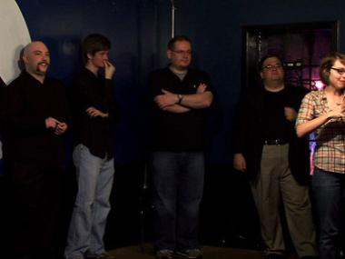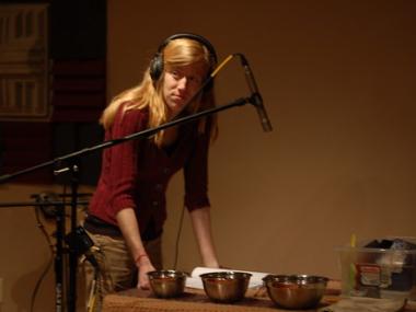 It takes a surprising amount of people, objects and coordination to make it sound like someone is walking up a flight of creaky old stairs. It works like this: one guy lightly drops one foot on an upturned wooden drawer, quickly, so it sounds like two feet. A woman stands next to him, twisting a water-soaked cork into the neck of a wine bottle as he steps. The director, a guy with a folded copy of the script and big headphones, adjusts a mic on the floor and asks for a little less squeaking. The whole process takes about ten minutes.
