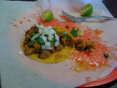 The dark red, brown and chrome interior makes the restaurant feel more like an upscale tapas bar than a family taco joint.
